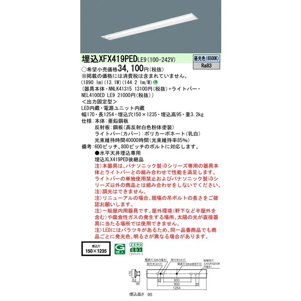 パナソニック iDシリーズ 天井埋込型 40形 一体型LEDベースライト リニューアル 下面開放型 W150 XFX419PEDLE9 昼光色(6500K)
