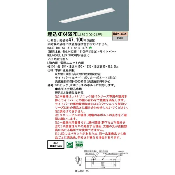 パナソニック iDシリーズ 天井埋込型 40形 一体型LEDベースライト リニューアル 下面開放型 W150 XFX469PELLE9 電球色(3000K)