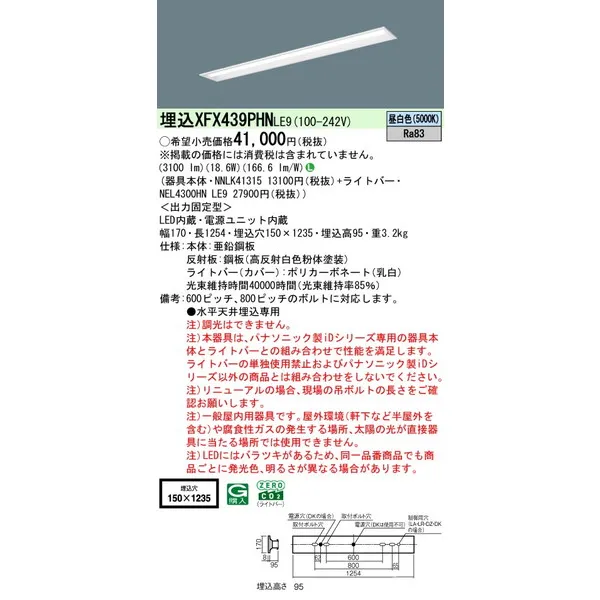 パナソニック iDシリーズ 天井埋込型 40形 一体型LEDベースライト リニューアル 下面開放型 W150 XFX439PHNLE9 昼白色(5000K)