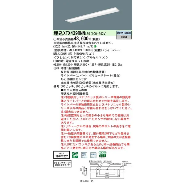 パナソニック iDシリーズ 天井埋込型 40形 一体型LEDベースライト リニューアル 下面開放型 W190 XFX439RNNLE9 昼白色(5000K)