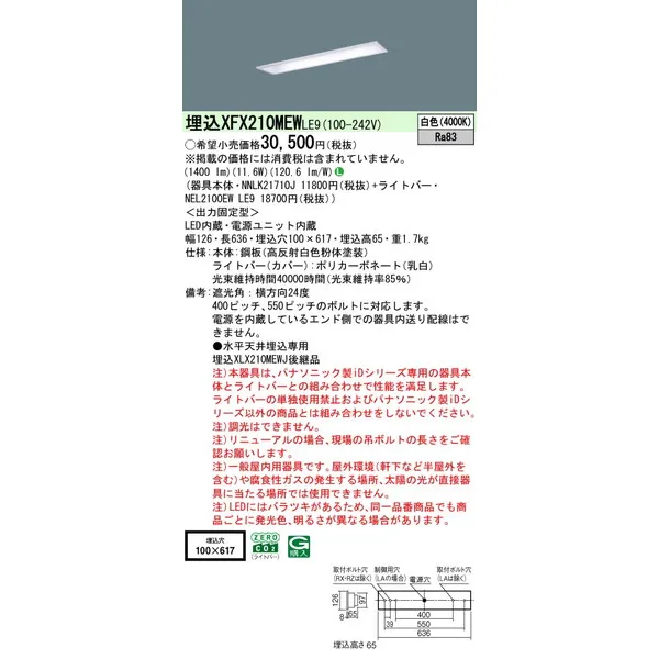 パナソニック iDシリーズ 天井埋込型 20形 一体型LEDベースライト 下面開放型 W100 XFX210MEWLE9 白色(4000K)