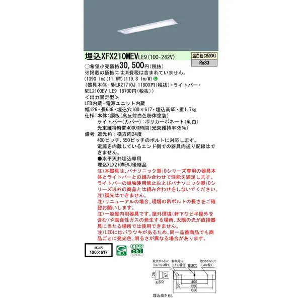 パナソニック iDシリーズ 天井埋込型 20形 一体型LEDベースライト 下面開放型 W100 XFX210MEVLE9 温白色(3500K)