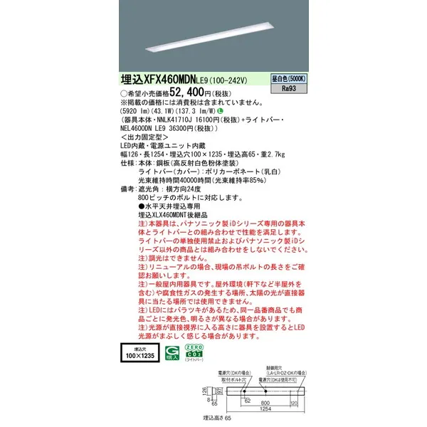 パナソニック iDシリーズ 天井埋込型 40形 一体型LEDベースライト 下面開放型 W100 XFX460MDNLE9 昼白色(5000K)