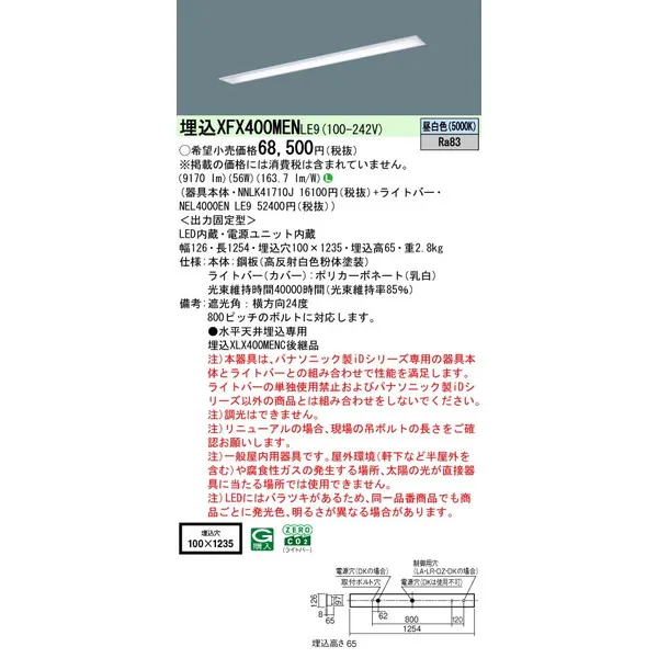 パナソニック iDシリーズ 天井埋込型 40形 一体型LEDベースライト 下面開放型 W100 XFX400MENLE9 昼白色(5000K)
