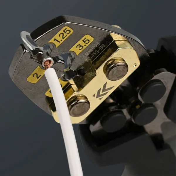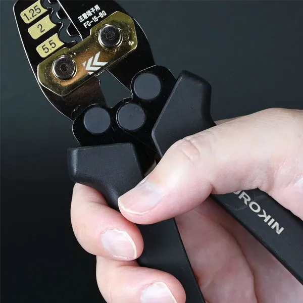 ダイスの圧着面積を最小限に抑えることで、力を一点に集中させ、 軽い力でも確実に端子を圧着できる設計となっています。 これにより、連続作業やサイズの大きい端子など、力を要する圧着作業 でも手への負担を大幅に軽減。作業者の疲労を軽減し、長時間の使用でも快適に作業を続けられるため、作業性を大きく向上させることができます。