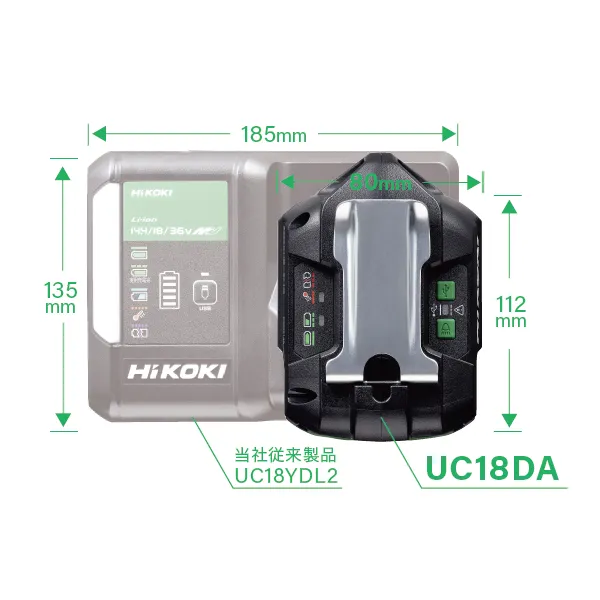 従来の充電器よりも大幅な小形化を実現。180gの軽さで持ち運びやすく、上部のフックでベルトへの取付けも可能です。