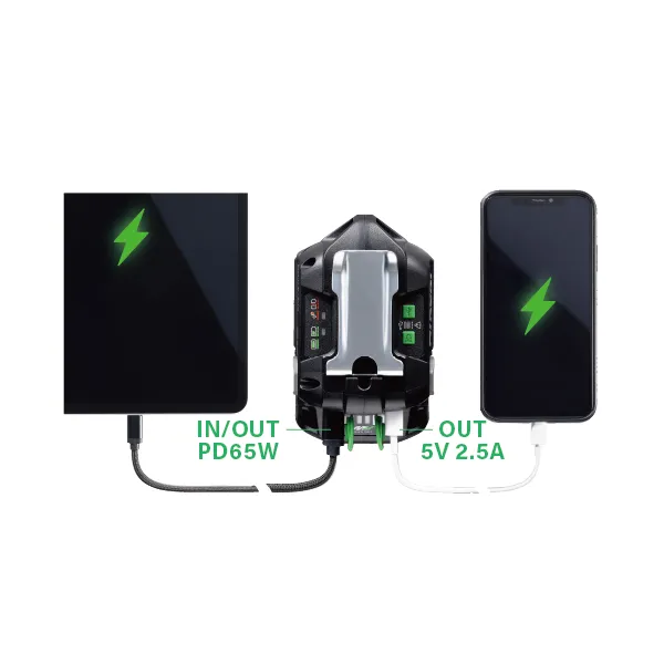 充電可能蓄電池 マルチボルト蓄電池、18Vリチウムイオン電池(BSL18XXシリーズ)、14.4Vリチウムイオン電池(BSL14XXシリーズ) 使用温度範囲 0?30℃ 外形寸法(全長×全幅×全高) 112×80×53mm 質量 0.18kg 入力/出力端子(Type-C) 【PD対応】5V/3A, 9V/3A, 15V/3A, 20V/3.25A(最大65W) 出力端子(Type-C) 5V/2.5A(最大12.5W) 光束 300lm 照度 750lx(光源より先方0.5m) 標準付属品 ACアダプタ(USB Type-C 最大出力65W)、 USBケーブル(USB Type-C to Type-C 1m)