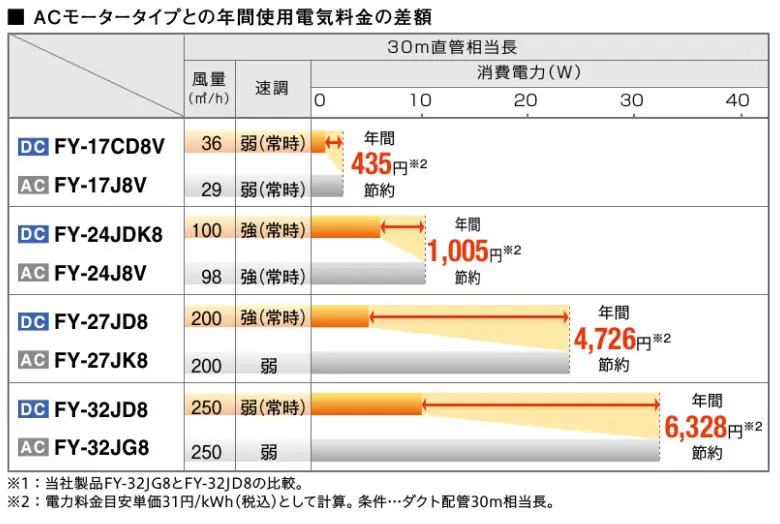実際の商品の性能を比較してみます。比較するのはパナソニックFY-24JDK8(DCモーター)とFY-24J8V(ACモーター)の2機種です。